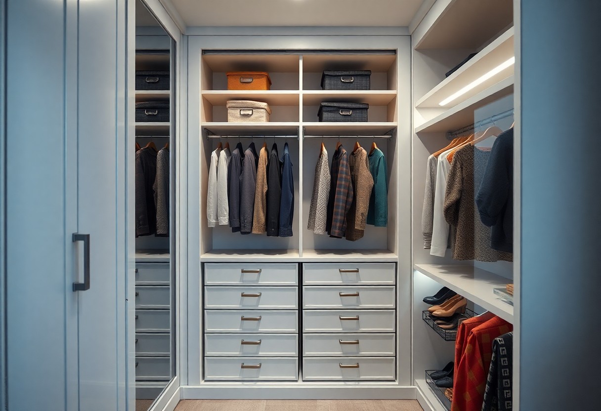 Double up on function by installing a second hanging rod 90-110cm below your main rail to separate shirts from trousers and instantly increase capacity by roughly 40-50%. Shelf risers and clear bins keep seasonal items accessible, while slimline velvet hangers at 4mm save width compared with plastic. If you use labelled boxes for shoes and accessories, you cut morning search time; however, avoid overloading top shelves as heavy boxes can topple and cause injury.