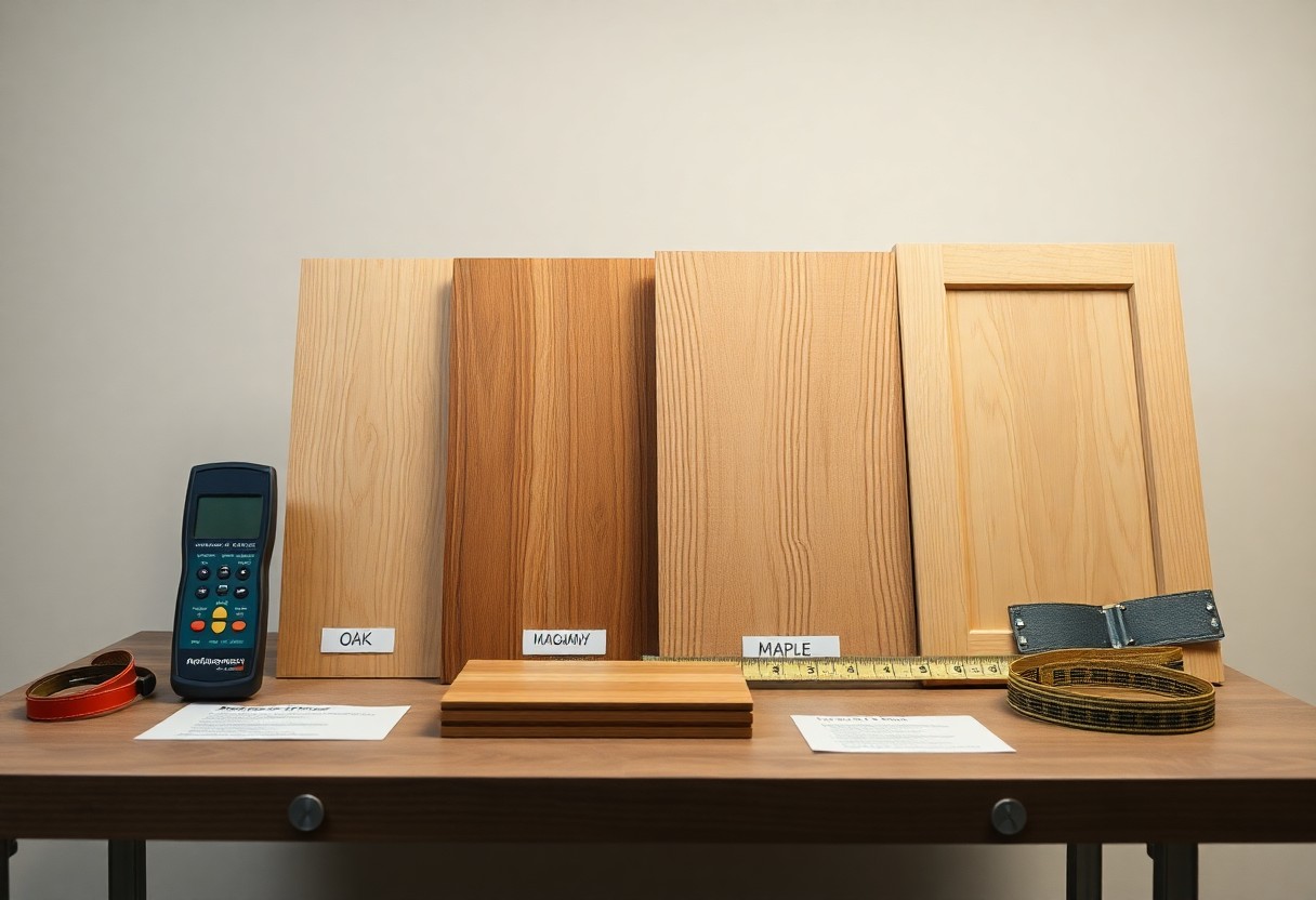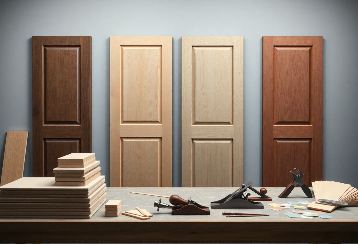 You’ll see species differ in density, grain and stability: oak (~700 kg/m³) resists wear, pine is lighter and cheaper, and engineered constructions control movement; typical internal door moisture content targets 8-12% and common thicknesses run 35-44 mm. Knowing how species, moisture and construction interact helps you predict finish behaviour and long‑term fit.