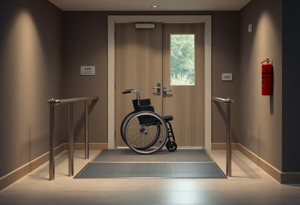 Part M and BS 8300 set clear targets: provide a clear door width of around 800mm, a wheelchair turning circle of 1500mm and ramp gradients no steeper than 1:12 for short runs. You should aim for level thresholds or an upstand under 15mm, and place light switches and controls between 900-1100mm above floor level to meet typical accessible-design expectations.