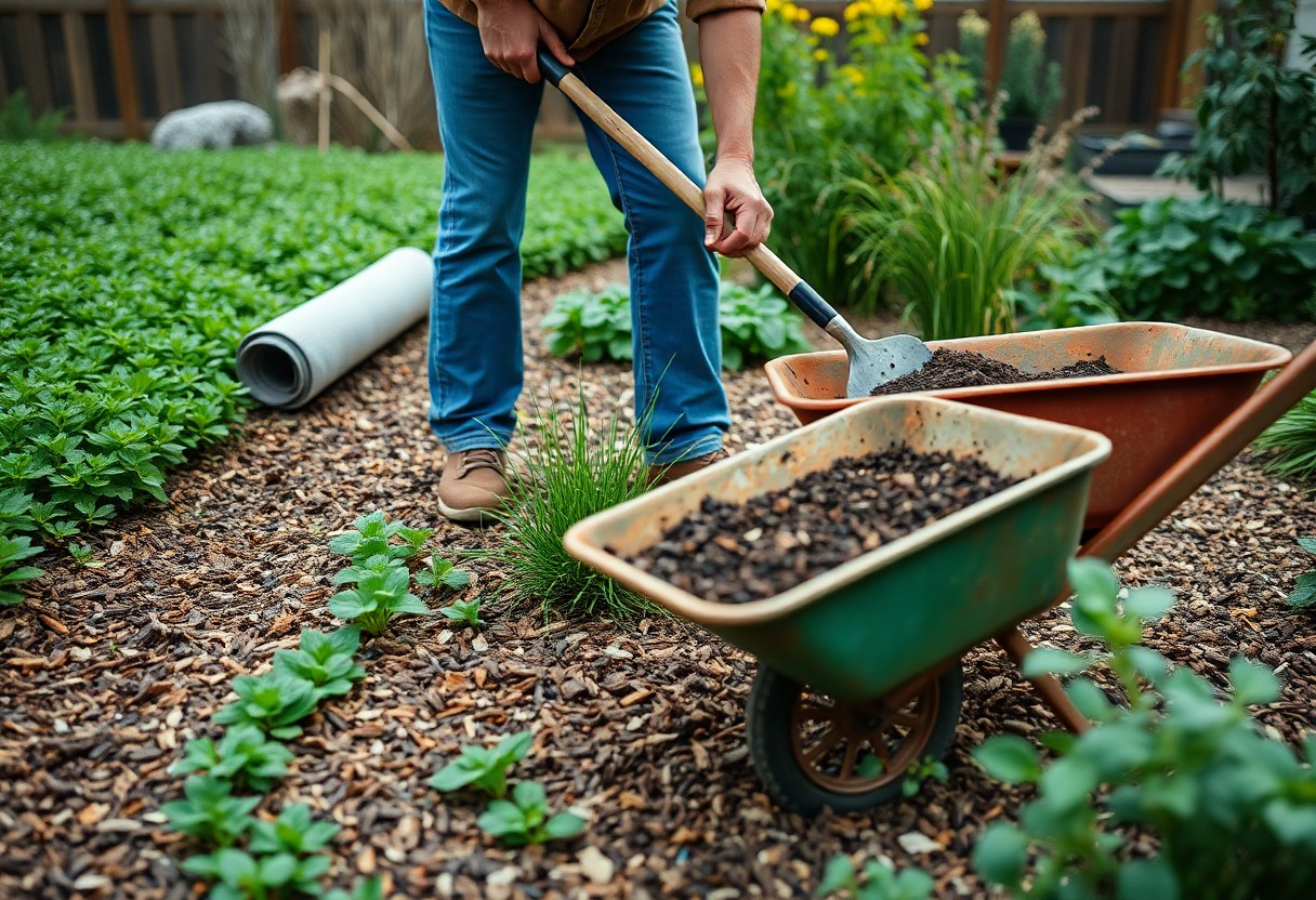 You should prioritise simple, targeted measures: apply mulch to a depth of 5-7.5 cm to suppress most annual weeds, use landscape fabric under paths, and hand-weed weekly or fortnightly before seed set; plant groundcovers like thymus or sedum to outcompete weeds; install drip irrigation to reduce foliar disease; and avoid broad-spectrum insecticides that harm pollinators and beneficials-spot-treat with insecticidal soap or neem oil only when infestations exceed visible thresholds.