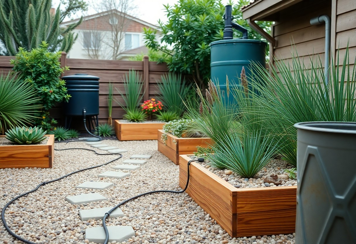 Install a 200-300 litre water butt for a small plot or a 1,000-2,500 litre tank for larger plots; fit a first-flush diverter, leaf mesh and an overflow to keep water clean and routed safely. You can run drip lines directly from a gravity header or add a pump; harvested rain often reduces mains water use but is not potable, so restrict it to irrigation and outdoor tasks.