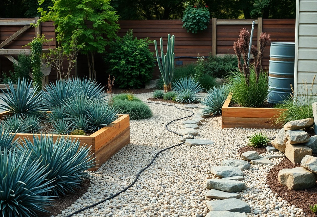 To wrap up, focus on selecting native, drought-tolerant plants, grouping them by water needs, using quality mulch and well-draining soil, installing efficient irrigation and hard-wearing materials, and designing simple planting schemes that reduce pruning and weeding; these steps help you maintain an attractive, low-maintenance garden with minimal time and effort.